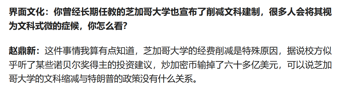 不过这种消息是很难证实或证伪的,所以赵鼎新也用了“据说”“似乎”这种字眼。但是能知道的是,芝加哥大学确实是炒币的,芝加哥大学的炒币也是亏过钱的,芝加哥大学的财政也一直是有问题的......但是到底炒币亏了多少,对财政的影响是多少,是不是导致缩减文科的直接原因,那就很难说了。
