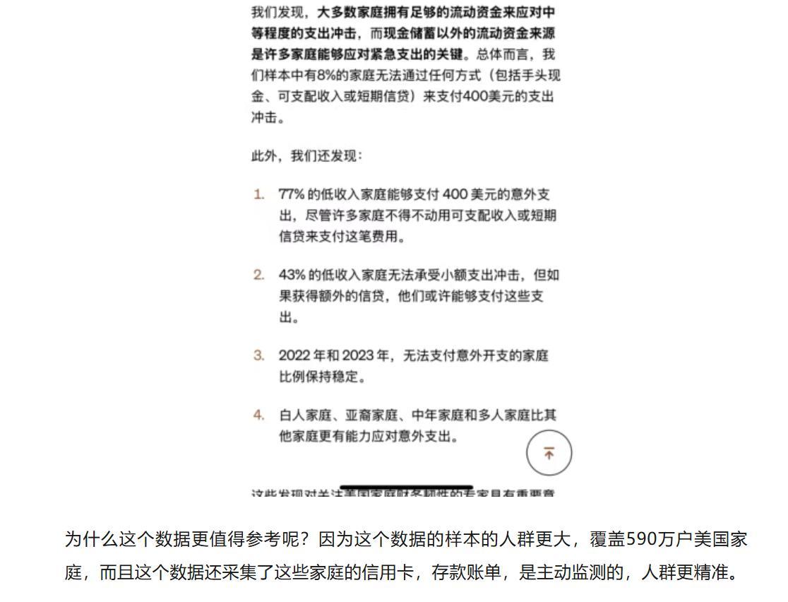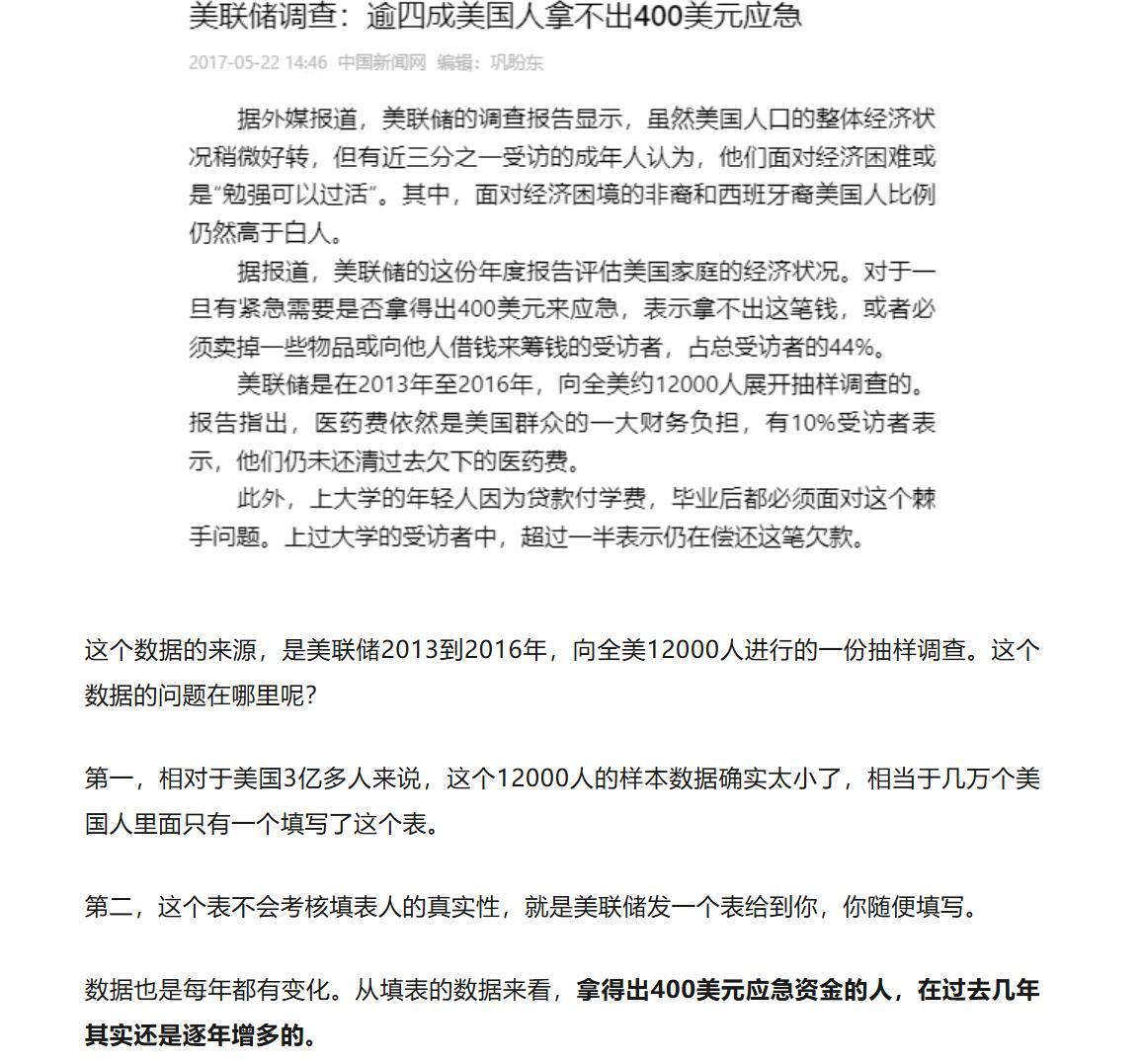 比如文章一个主要观点,是否认美联储调查的“将近四成美国人拿不出应急”这样一个结论: